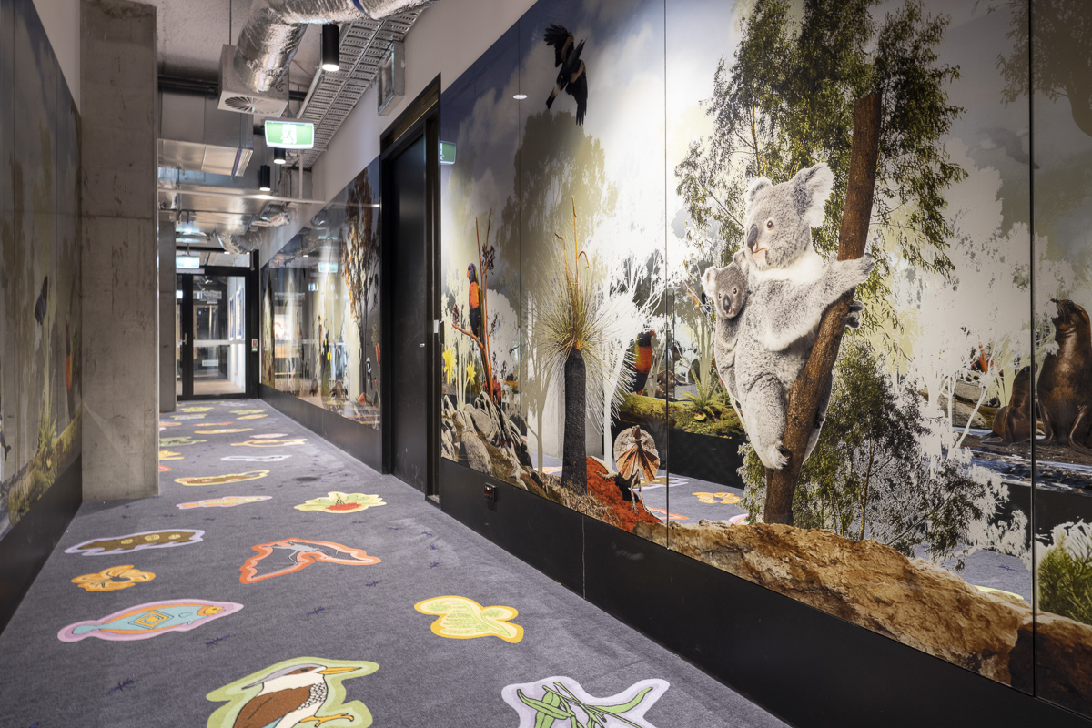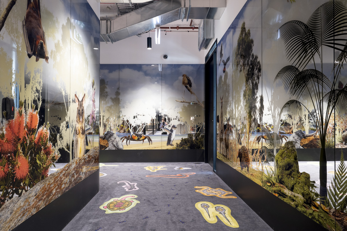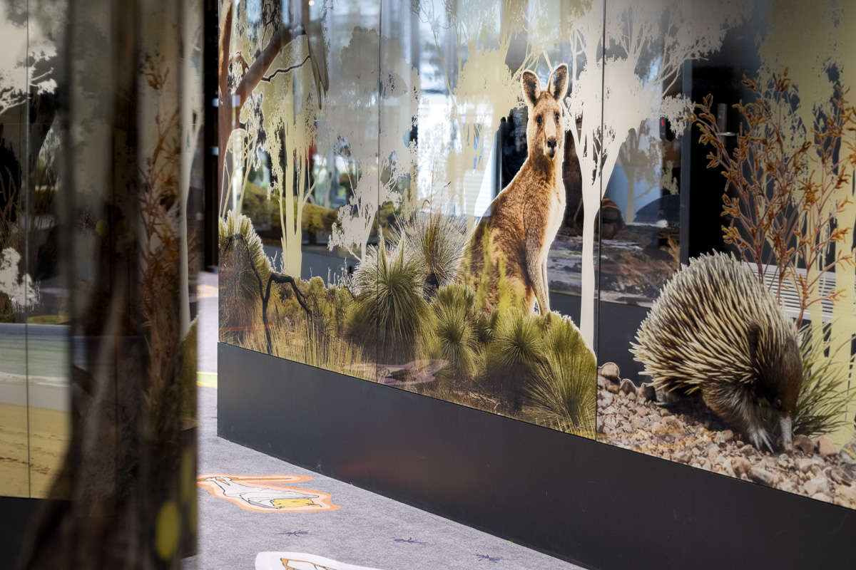 One of the highlights of the new library is the children’s section, a vibrant and inviting space designed to spark imagination and creativity. The passageway to the children’s library features artwork by First Nation artists inspired by Australia’s diverse fauna and flora. Viridian PixaGraphic™ was utilised to print the artwork onto mirrored glass panels, and installed along the passageway leading to this section, where the featured intricate designs turn the space into an immersive forest environment.